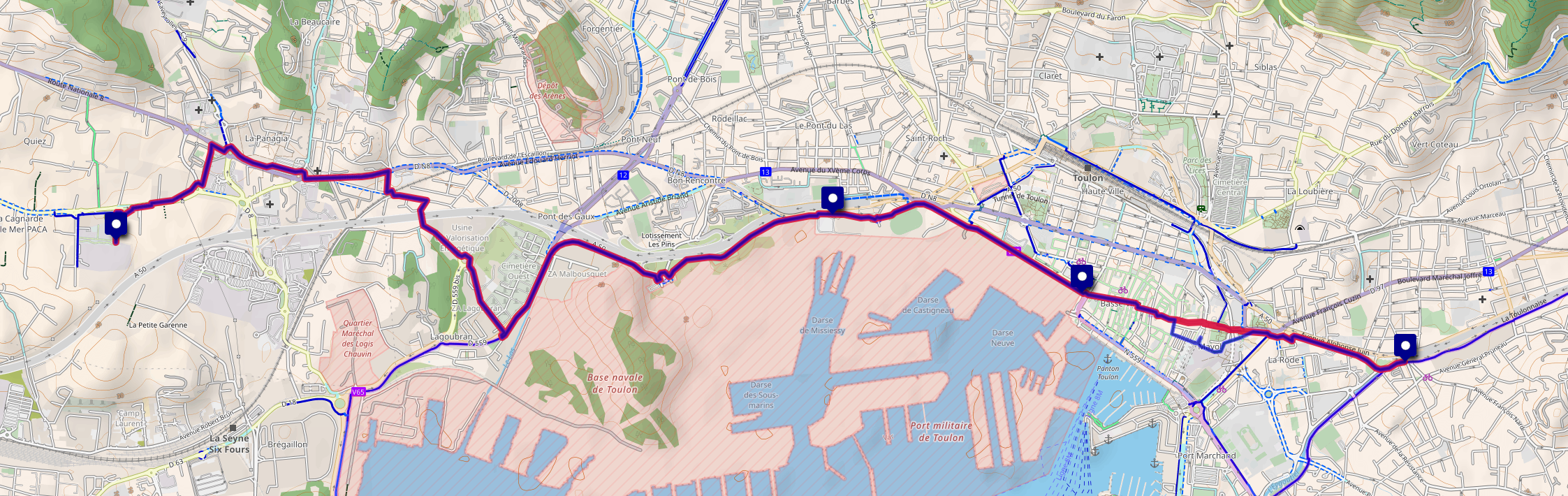 Du lundi au vendredi, matin et soir, nous avons traversé la ville ensemble. Départ à 7h30 depuis la porte des Oliviers sur la V65 ; retour à 17h00 depuis le site de Naval Group.